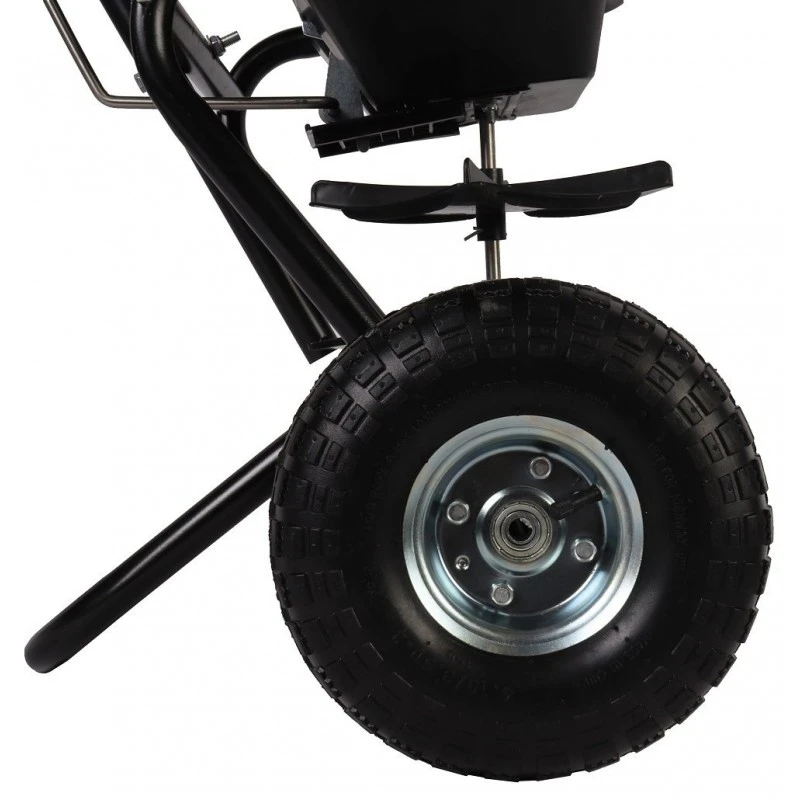 Deze strooiwagen is voorzien van luchtbanden, door deze banden is het rijden over oneffen terrein geen enkel probleem. De bedieningshendel zit hoog geplaatst zodat de te strooien hoeveelheid eenvoudig ingesteld kan worden.